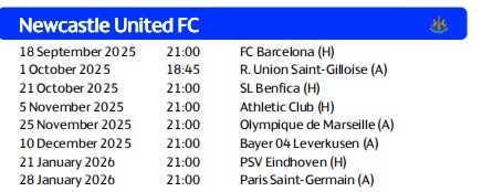 注册账号-纽卡斯尔欧冠征程:揭幕战主场对阵巴萨,收官战客场直面巴黎