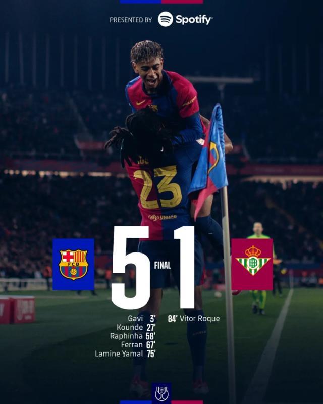 赛程信息-【国王杯】多点开花,巴萨主场5比1贝蒂斯晋级八强!